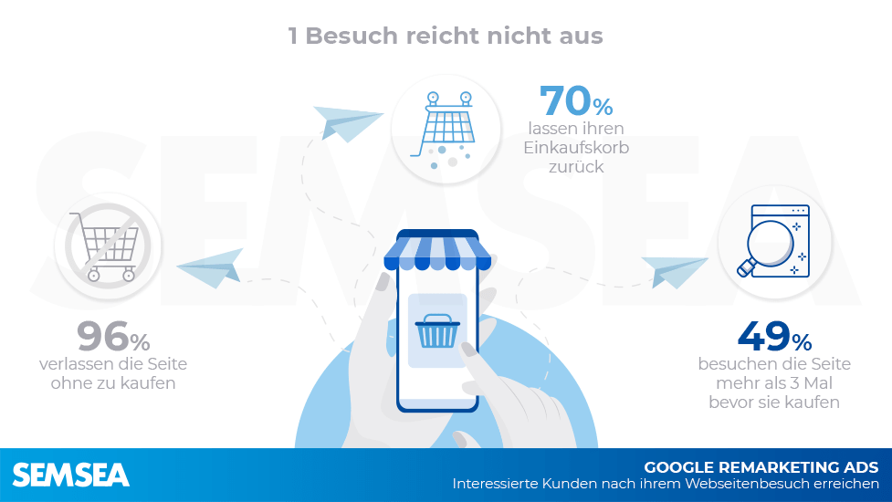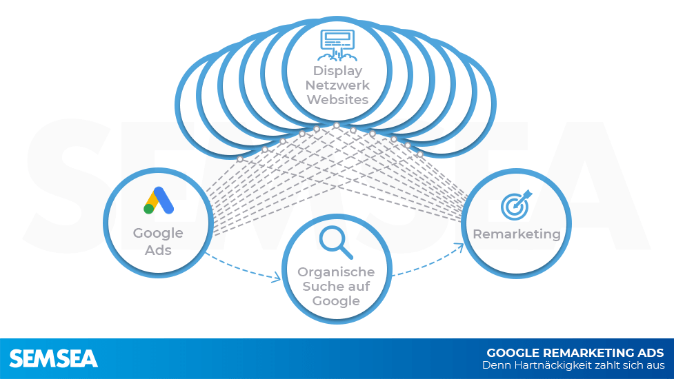 Google Remarketing bedeutet, dass Sie die Besucher Ihrer Website mit einer Text- oder Bildanzeige über das Google Display-Netzwerk oder über Google Search wieder erreichen. Und zwar nachdem diese Ihre Website besucht, sie aber ohne Aktion (Kauf, Kontaktaufnahme o.ä.) wieder verlassen haben. Eine Zielgruppe also, bei welcher bereits ein erhöhtes Interesse an Ihrem Unternehmen und/oder Angebot besteht.